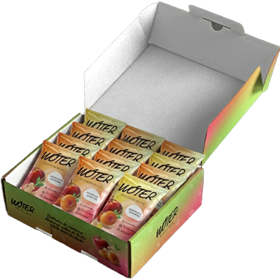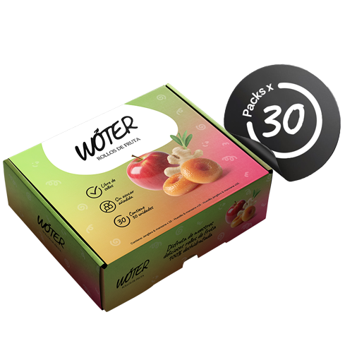 Compuesto por 30 packs de rollos de fruta deshidratada: 10 unidades sabor Huesillo y manzana, 10 unidades sabor jengibre y manzana y 10 unidades sabor huesillo, jengibre y manzana.
